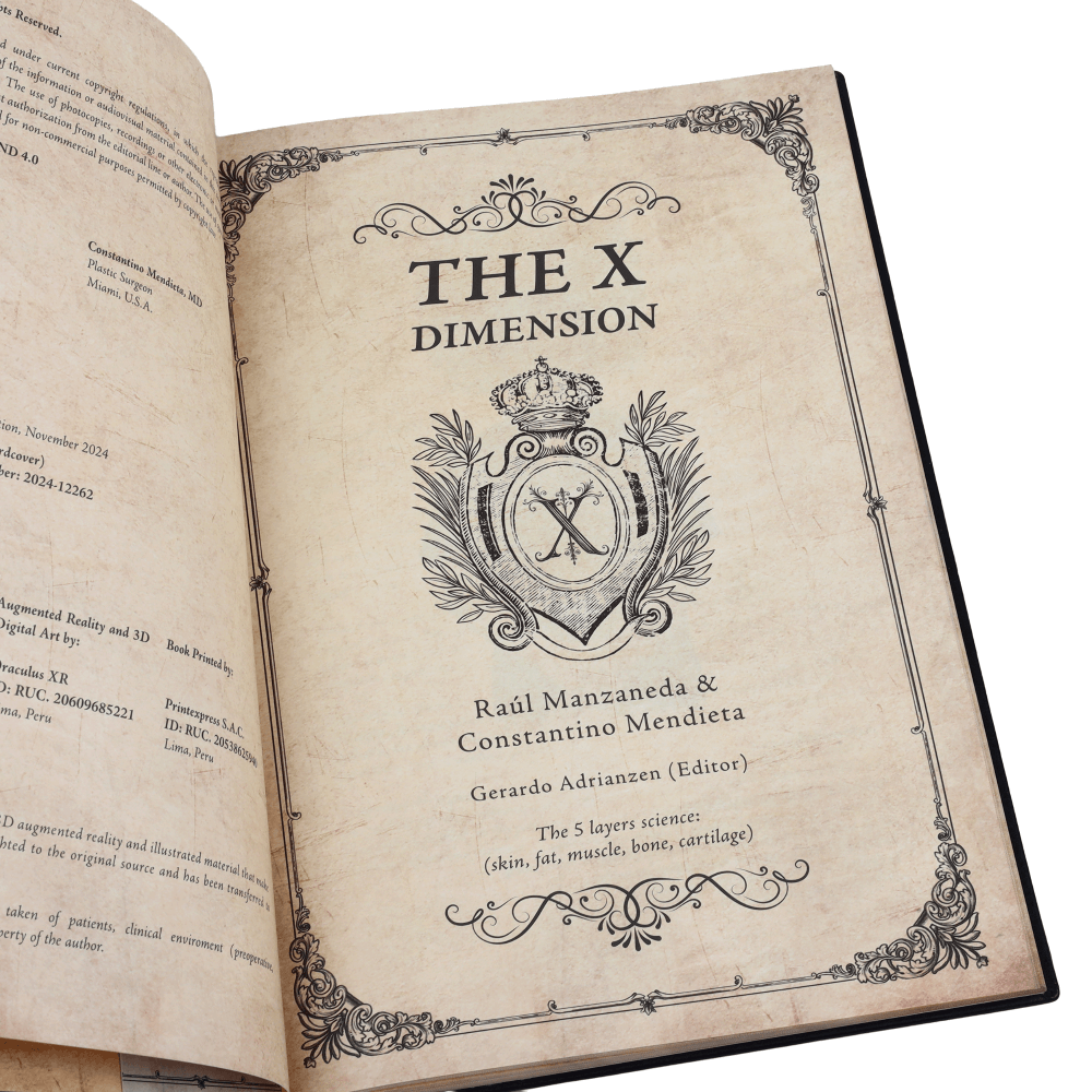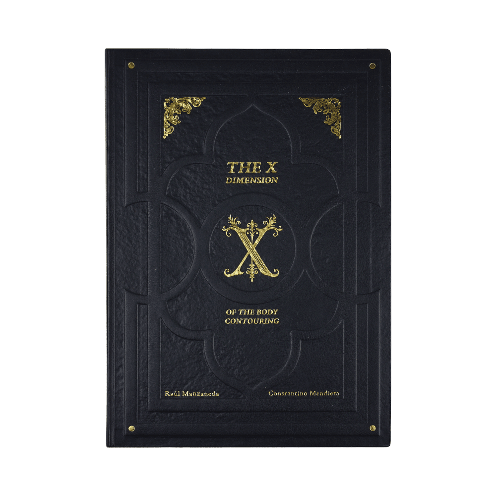 Discover ‘The X Dimension of Body Contouring,’ an exquisite hardcover volume authored by Raul Manzaneda and Constantino Mendieta. This distinguished medical text features a striking black cover with elegant silver embellishments and classical architectural design elements. The book presents a comprehensive collection of clinical imagery, photographs, videos, and cutting-edge 3D augmented reality illustrations focused on body contouring procedures. This authoritative work combines artistic presentation with medical expertise, making it an invaluable resource for medical professionals in the field of aesthetic surgery. The sophisticated design, with its embossed patterns and ornate ‘X’ monogram, reflects the premium nature of its contents. Each visual element has been carefully curated to provide detailed insights into pre-operative, intra-operative, and post-operative scenarios, creating a complete educational experience for practitioners.